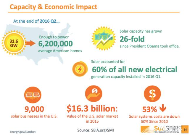 截止2016年6月底,美國的光伏裝機量已達31.6吉瓦,比奧巴馬總統(tǒng)就任時增長了26倍,這些光伏所發(fā)電量足以滿足620萬個家庭的用電。目前光伏發(fā)電量占到總供電量約1%。2016年第一季度,美國新裝發(fā)電機組約60%來自光伏。2015年美國的光伏市場規(guī)模高達163億美元。