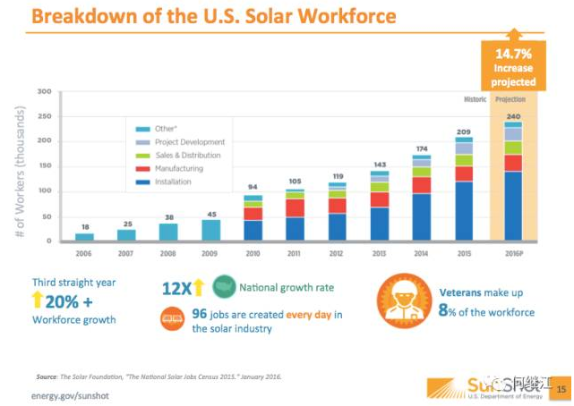 根據(jù)太陽能基金會第六次年度“2015年國家太陽能就業(yè)普查”報告,美國太陽能產(chǎn)業(yè)正在以驚人的速度創(chuàng)造高技能,高薪工作,使工人人數(shù)增加比總體經(jīng)濟快12倍。