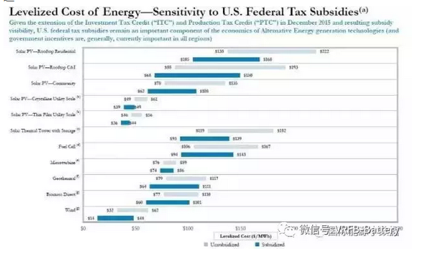 如果考慮聯(lián)邦稅收優(yōu)惠,那么各類替代能源的全生命周期平準(zhǔn)成本下降幅度可達(dá)30%: