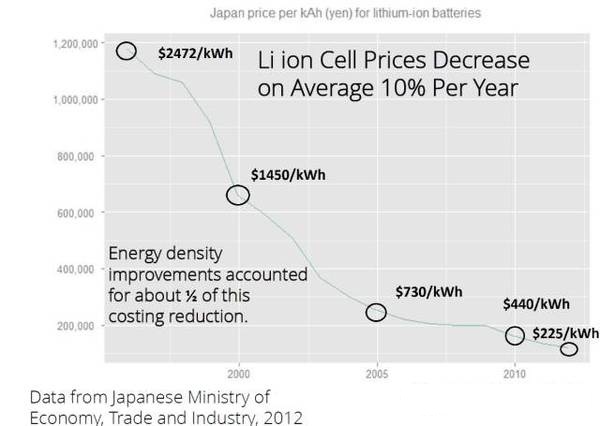 中國(guó)儲(chǔ)能網(wǎng)訊:根據(jù)日本經(jīng)濟(jì)產(chǎn)業(yè)省的數(shù)據(jù),鋰電池的成本在過去20年里每年平均下降10%。從上個(gè)世紀(jì)90年代中的2472美元/千瓦時(shí)降至2010年的440美元/千瓦時(shí),目前成本降至200-300美元/千瓦時(shí)。那么,有沒有可能鋰電池的成本在較短的時(shí)間降至100美元/千瓦時(shí)?如果達(dá)到這個(gè)水平,能源世界勢(shì)將面臨新的革命。