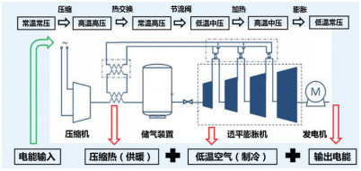一個宜居城市或城鎮(zhèn),居民需要的不僅是電,而且夏需冷,冬需暖。以電制冷(常規(guī)空調(diào))不經(jīng)濟,燃煤以取暖,更應嚴令禁止。中國應該發(fā)明一種既可蓄能發(fā)電,又能供熱供冷的電熱冷三聯(lián)供的新型儲能系統(tǒng)。在蕪湖市高新開發(fā)區(qū)已建成一套500kW容量的集供應電、熱水和冷風為一體的“三聯(lián)供”系統(tǒng),可發(fā)電450 kW·h,可覆蓋3850 m2的供暖面積(約為50余戶家庭)。夏季每天可供300 m2的商場、寫字樓或蔬菜保鮮庫3℃的冷風。如果智能微網(wǎng)中的儲能單元采用上述的壓縮空氣儲能技術以替代常規(guī)的電池儲能單元,則這種智能微電網(wǎng)群就成為“智能微能源網(wǎng)群”了。