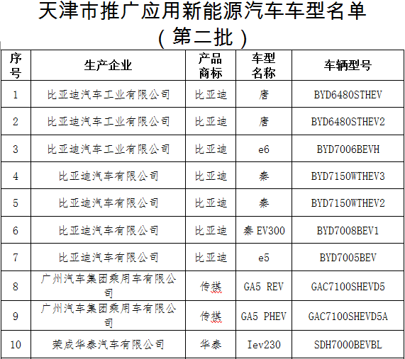 附件:天津市推廣應(yīng)用新能源汽車車型名單(第二批)