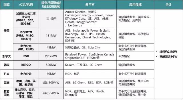 從2015年下半年開(kāi)始,國(guó)際儲(chǔ)能市場(chǎng)發(fā)展迅速。根據(jù)CNESA的統(tǒng)計(jì),2015年7月-2016年12月,全球新增的規(guī)劃儲(chǔ)能裝機(jī)為2.5GW(不包含抽水蓄能和儲(chǔ)熱項(xiàng)目),其中已經(jīng)部署的近1.0GW。用戶側(cè)儲(chǔ)能市場(chǎng)和調(diào)峰調(diào)頻輔助服務(wù)市場(chǎng)是兩個(gè)主要發(fā)展領(lǐng)域。