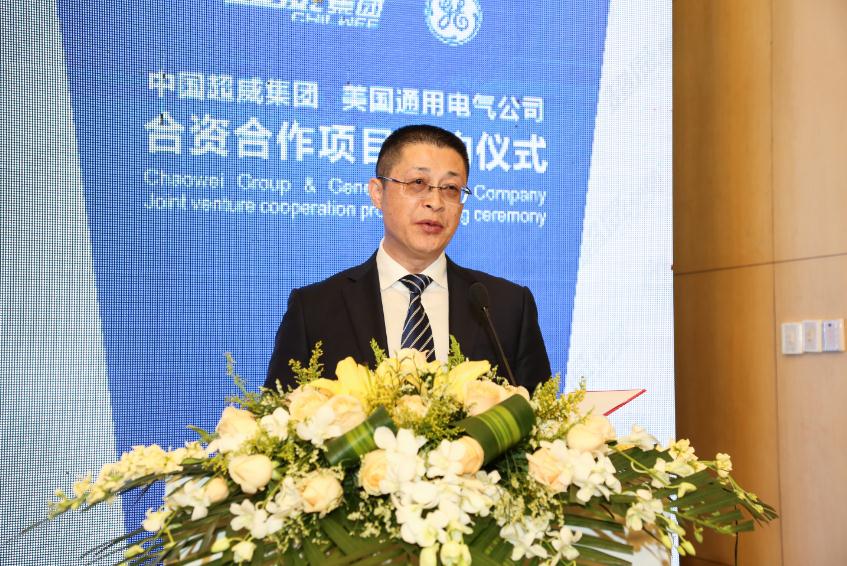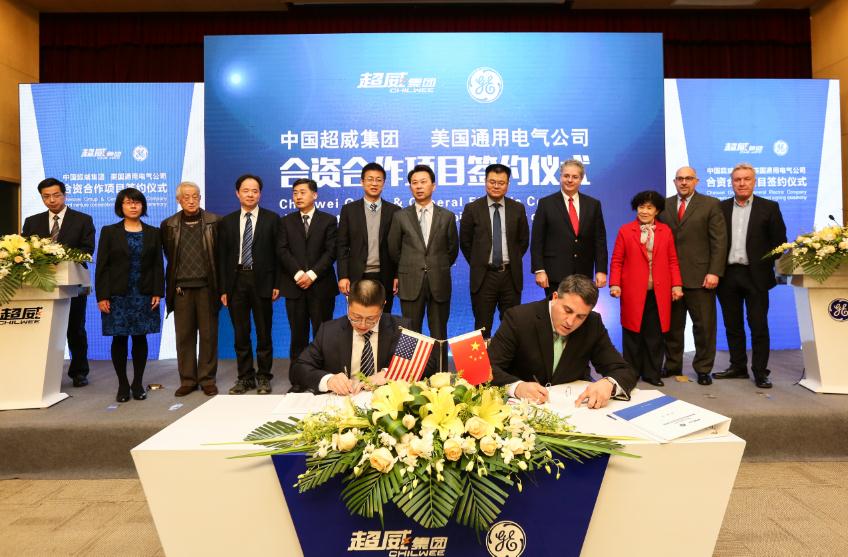 超威集團(tuán)董事長(zhǎng)周明明(前排左)正在與GE公司代表簽約