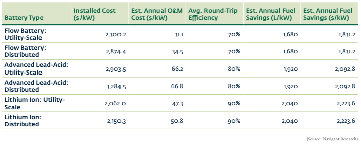 報(bào)告中特別指出,除了電網(wǎng)基礎(chǔ)設(shè)施依靠?jī)?chǔ)能系統(tǒng)可以提供更多的服務(wù)外,偏遠(yuǎn)地區(qū)的微電網(wǎng)還因儲(chǔ)能系統(tǒng)的接入而極大地降低了對(duì)柴油發(fā)電的依賴性。在年度節(jié)油方面,公共事業(yè)規(guī)模儲(chǔ)能和分布式鋰離子儲(chǔ)能都比燃油具有更明顯的優(yōu)勢(shì),安裝成本分別是2062美元/kW和2150.3美元/kW,節(jié)油成本均達(dá)到2223.6,美元/kW。
