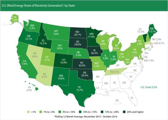 在美國各州中,愛荷華州的風能在能源占比中最高,達到 36.3%;其次是堪薩斯州,占比 30%;排在第三位的是南達科他州,占比 29%。這三個州都位于美國中部,風力資源豐富。