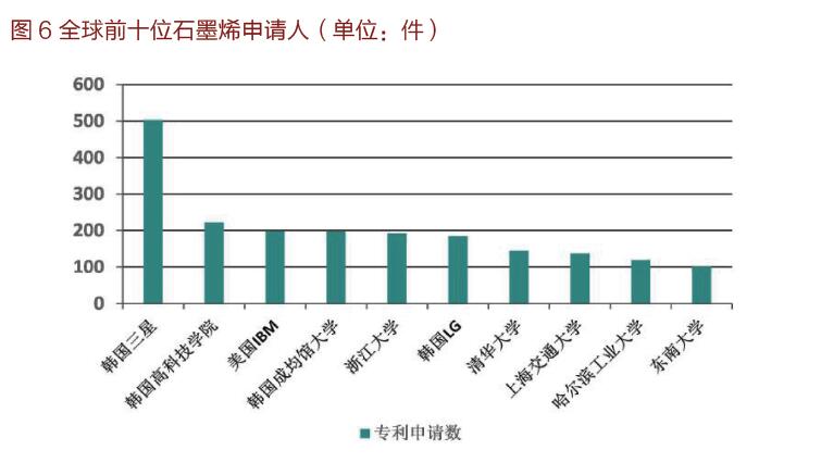 在全球主要優(yōu)先專(zhuān)利申請(qǐng)件數(shù)排位中,中國(guó)、韓國(guó)和美國(guó)名列前三名,分別為 6741、2892 和 2632 件。在全球前十位石墨烯申請(qǐng)人中,中國(guó)研究機(jī)構(gòu)占了 5 位,全部為中國(guó)高校,但第 1、3、6 名均為韓國(guó)和美國(guó)大型跨國(guó)企業(yè)。通過(guò)對(duì)專(zhuān)利技術(shù)的觀察,國(guó)外高校和企業(yè)掌握了大量核心專(zhuān)利,而且專(zhuān)利布局更偏向石墨烯的產(chǎn)業(yè)化應(yīng)用,在石墨烯產(chǎn)業(yè)化進(jìn)程中扮演著重要角色。中國(guó)雖然在石墨烯專(zhuān)利數(shù)量上位列世界第一,但是企業(yè)參與主體和石墨烯應(yīng)用技術(shù)多方面布局還需加強(qiáng)。