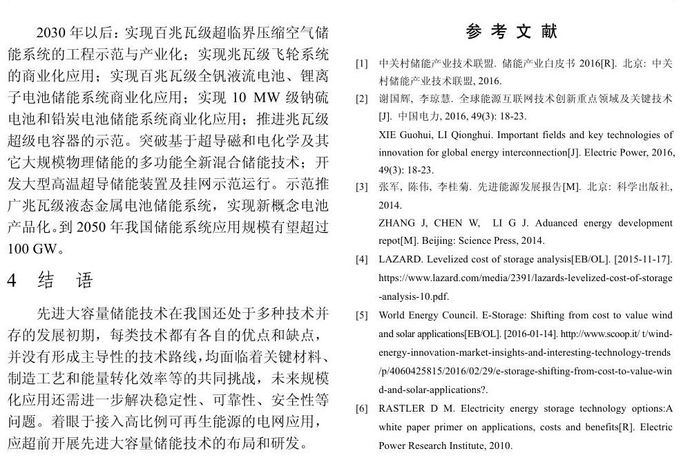 先進大容量儲能技術在我國還處于多種技術并存的發(fā)展初期,每類技術都有各自的優(yōu)點和缺點,并沒有形成主導性的技術路線,均面臨著關鍵材料、制造工藝和能量轉化效率等的共同挑戰(zhàn),未來規(guī)?;瘧眠€需進一步解決穩(wěn)定性、可靠性、安全性等問題。著眼于接入高比例可再生能源的電網(wǎng)應用,應超前開展先進大容量儲能技術的布局和研發(fā)。