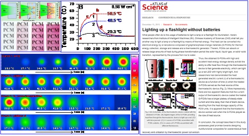 最后,以廢熱富集、高效轉(zhuǎn)換利用為導(dǎo)向,通過(guò)器件的系統(tǒng)集成,研制了基于廢熱發(fā)電的熱電轉(zhuǎn)換器件。利用石墨烯(Graphene)平面單層結(jié)構(gòu)便于電子快速傳輸從而提供良好的導(dǎo)熱性,綜合石墨烯良好的導(dǎo)熱性能和相變材料較高的相變潛熱,王振洋團(tuán)隊(duì)通過(guò)高溫蒸發(fā)和室溫下空氣中干燥的方法合成了一種新穎石墨烯和相變材料的復(fù)合材料,其中的石墨烯以三維網(wǎng)絡(luò)狀結(jié)構(gòu)被組裝在相變材料聚乙二醇(PEG)基質(zhì)中,為材料進(jìn)行快速熱傳導(dǎo)提供了良好的通路。另外,該團(tuán)隊(duì)首次證明G-PEGs的熱收集和存儲(chǔ)并為熱電設(shè)備提供熱源的能力。G-PEGs提供熱流通過(guò)熱電設(shè)備快速發(fā)電,可以點(diǎn)亮LED燈珠(Nanoscale, 2015, 7:10950;RSC Adv., 2017, 7:10683)。該工作并被“Atlas of Science”網(wǎng)站以“不用電池來(lái)點(diǎn)亮小手電”(“Lighting up a flashlight without batteries”)為題進(jìn)行了相關(guān)報(bào)道,引起了同行們關(guān)注(http://atlasofscience.org/lighting-up-a-flashlight/#more-3618)。