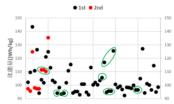 首先還是看一下目前鋰離子電池系統(tǒng)比能量的情況,數(shù)據(jù)來源于2017年《新能源汽車推廣應用推薦車型目錄》已經(jīng)發(fā)布了兩批目錄中的乘用車的情況,主要看一下公開的純電動乘用車電池系統(tǒng)數(shù)據(jù)(目錄中的乘用車數(shù)量相對很少,電動大巴數(shù)量遠超乘用車,還有些乘用車對應的電池數(shù)據(jù)在目錄參數(shù)中沒有標注),見圖1:黑色圓點是第一批目錄中的數(shù)據(jù),紅色圓點是第二批目錄中的數(shù)據(jù),數(shù)據(jù)包括了采用鎳鈷錳酸鋰(NCM)、錳酸鋰(LMO)和磷酸亞鐵鋰(LFP)正極材料的電池,其中,LFP的數(shù)據(jù)用藍色圓圈標示出來了。