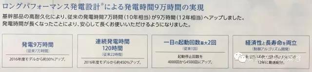 技術(shù)指標(biāo)方面,除了90%的系統(tǒng)效率之外,松下的2017年4月開始發(fā)售的新款產(chǎn)品的指標(biāo)也有提高,尤其是使用壽命長達(dá)9萬小時、啟停次數(shù)高達(dá)4500次,可以用到12年,相當(dāng)有吸引力。
