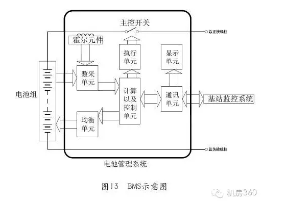 電池管理系統(tǒng)(BatteryManagementSystem,BMS)由監(jiān)測、保護電路、電氣、通訊接口、熱管理和電池組反接保護裝置等組成,是電池保護和管理的核心組成部分,不僅要保證電池安全可靠的使用,而且要充分發(fā)揮電池的性能和延長使用壽命,作為通信用的后備能源,BMS在開關(guān)電源和電池之間起到一個重要橋梁作用。對BMS的要求必須符合通信電源供電系統(tǒng)的要求,所以BMS的安全管理模式對電池的安全性至關(guān)重要。BMS主要包括數(shù)據(jù)采集單元、計算以及控制單元、均衡單元、控制執(zhí)行單元和通訊單元等。圖13為BMS示意圖。