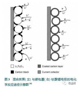 Cheng等采用熱氣相分解的方法,對(duì)鈦酸鋰顆粒進(jìn)行了有效的碳包覆,在鈦酸鋰表面形成了連續(xù)且厚度均勻( 約為 5 nm)的碳層,材料的電導(dǎo)率也由10-13 S·cm-1提高至2. 05 S·cm-1。在0. 2 mA/cm2的電流密度下,放電比容量為155 mAh/g。作者還比較了以炭黑作為導(dǎo)電劑與鈦酸鋰混合形成的電極材料及碳包覆鈦酸鋰這兩種材料間的電化學(xué)反應(yīng)途徑 的差異,如圖3所示。雖然前者的顆粒表面多數(shù)區(qū)域可與電解液接觸,利于鋰離子的擴(kuò)散,但真正發(fā)生的反應(yīng)僅限于具有電子導(dǎo)電路徑的位點(diǎn);而后者的碳包覆層則可為材料提供足夠多的電子導(dǎo)電路徑,包覆碳層中的晶體缺陷可使鋰離子順利通過(guò)碳層,因此碳包覆的鈦酸鋰顯現(xiàn)出了更高的倍率特性。