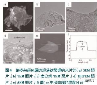 本課題組的Li等將四丁胺( TBAOH)作為分散劑、碳源及氮源,經(jīng)過(guò)熱處理后,在超薄二維鈦酸鋰納米片表面均勻地形成了約1~2 nm厚的氮摻雜的碳包覆層。鈦酸鋰納米片表面均勻包覆的氮摻雜碳層,可在整個(gè)電極中形成有效的導(dǎo)電網(wǎng)絡(luò),有利于電子的快速傳輸,而豐富的孔結(jié)構(gòu)則有利于鋰離子和電解液的擴(kuò)散,因而使該電極顯示出了超高的倍率性能。在100 C的倍率下,其可逆比容量仍然高達(dá)131 mAh/g。