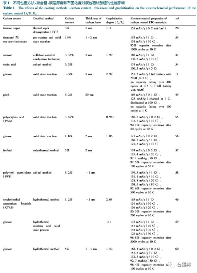 表1總結(jié)了不同包覆方法、碳含量、碳層厚度和石墨化度對(duì)碳包覆鈦酸鋰的性能影響。表中碳材料的石墨化程度由拉曼譜圖中D膜與G膜的峰強(qiáng)度比值( ID /IG)來(lái)表示,該比值越小則石墨化程度越高。從表中可以看出,碳包覆改善鈦酸鋰材料的電化學(xué)性能時(shí),其效果會(huì)受到碳包覆層狀態(tài),如石墨化程度、厚度和均勻性等因素的影響。