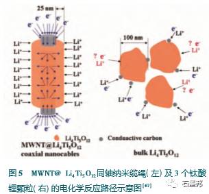 碳納米管具有獨(dú)特的一維管狀納米結(jié)構(gòu)、超高的長(zhǎng)徑比、優(yōu)異的導(dǎo)電性、大的比表面積、較高的機(jī)械強(qiáng)度和較好的化學(xué)穩(wěn)定性。與鈦酸鋰形成復(fù)合材料后,可增加活性物質(zhì)顆粒之間及活性物質(zhì)與集流體間的導(dǎo)電接觸,從而可顯著提高材料的導(dǎo)電性。Shen等利用溶膠凝膠法及后續(xù)水熱處理、煅燒處理等過(guò)程,制備了一種同軸納米纜繩型核殼結(jié)構(gòu)的多壁碳納米管與鈦酸鋰的復(fù)合材料,其示意圖如圖5所示。該材料的“核”為高導(dǎo)電性的多壁碳納米管,可提供良好的導(dǎo)電連接,而“殼”是由納米鈦酸鋰顆粒構(gòu)成,形成約25 nm厚的多孔結(jié)構(gòu),可為材料提供較大的電極/電解液接觸界面,從而縮短鋰離子的擴(kuò)散距離。與鈦酸鋰納米顆粒相比,納米纜繩型核殼結(jié)構(gòu)的鈦酸鋰復(fù)合材料,具有更高的電導(dǎo)率及鋰離子嵌入動(dòng)力學(xué),因而獲得了較高的倍率性能及循環(huán)穩(wěn)定性。在40 C和60 C的倍率下仍分別有96. 1 mAh/g和68 mAh/g的比容量,在1 C的倍率下循環(huán)100次后,容量?jī)H衰減了5. 6%。