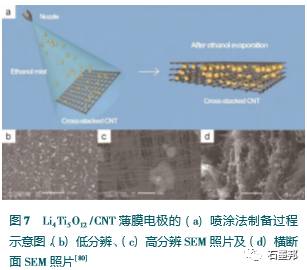 Wu等利用從定向碳納米管陣列拉制而成的定向碳納米管薄膜作為柔性骨架,將含有鈦酸鋰顆粒的懸液噴涂其上,并覆蓋上另一層碳納米管薄膜后,繼續(xù)進(jìn)行噴涂,反復(fù)5次后,得到了Li4Ti5O12 /CNT柔性電極,如圖7所示。在該電極中,碳納米管網(wǎng)絡(luò)為電子提供高效的傳輸路徑,同時(shí)其良好的機(jī)械性能確保了電極的機(jī)械強(qiáng)度,因而該電極在電化學(xué)穩(wěn)定性和機(jī)械強(qiáng)度上均優(yōu)于漿料涂布式極片。將用該方法制備的磷酸鐵鋰和鈦酸鋰的柔性電極分別作為正負(fù)極,可組裝成具有穩(wěn)定的電壓輸出、良好的循環(huán)、倍率性能和可彎折的全電池。