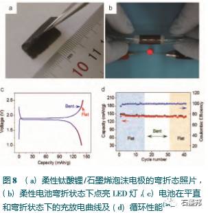 本課題組采用水熱法在三維連通網(wǎng)絡(luò)結(jié)構(gòu)的石墨烯泡沫表面原位生長(zhǎng)磷酸鐵鋰和鈦酸鋰,設(shè)計(jì)并制備出了可快速充放電的柔性正負(fù)電極,并組裝成了柔性全電池,如圖8所示。用輕質(zhì)的石墨烯泡沫取代金屬作為集流體,可有效降低電極中非活性物質(zhì)的比例,而三維石墨烯網(wǎng)絡(luò)的高導(dǎo)電性和多孔結(jié)構(gòu),則為鋰離子和電子提供了快速擴(kuò)散通道,可實(shí)現(xiàn)電極材料的快速充放電性能。利用所制備的柔性正負(fù)電極組裝成的鋰離子電池,在反復(fù)彎折的條件下,其結(jié)構(gòu)和充放電特性保持不變。為了實(shí)現(xiàn)柔性電極的實(shí)際應(yīng)用,本課題組嘗試采用化學(xué)法膨脹剝離的高導(dǎo)電、大片層石墨烯作為集流體,制備出了鈦酸鋰/石墨烯及磷酸鐵鋰/石墨烯一體化柔性電極。通過(guò)真空抽濾,使大尺寸的石墨烯納米片相互搭接形成集流體,同時(shí)使活性電極漿料部分滲入石 墨烯中,與作為集流體的石墨烯形成緊密接觸,有效降低了電極的界面電阻。所制得的柔性全電池可在平直和彎折狀態(tài)下正常工作,且具有較高的能量密度。