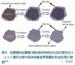 He等進(jìn)一步研究發(fā)現(xiàn),構(gòu)建阻擋層是控制鈦酸鋰與周圍電解液發(fā)生界面反應(yīng)的有效方法,利用納米尺度的碳包覆層可有效抑制鈦酸鋰電池的脹氣反應(yīng)。電解液對(duì)碳包覆的鈦酸鋰和未包覆的鈦酸鋰展現(xiàn)出了不同的反應(yīng)活性。對(duì)于未包碳的鈦酸鋰,在0~2. 5 V的電壓區(qū)間循環(huán)時(shí),電解液會(huì)在0. 7 V左右發(fā)生還原分解反應(yīng),而對(duì)于碳包覆的鈦酸鋰,類似的反應(yīng)僅在首次循環(huán)內(nèi)發(fā)生。碳包覆層可將鈦酸鋰顆粒表面的活性位點(diǎn)覆蓋,并形成一層固體電解液界面膜,將活性位點(diǎn)與周圍的電解液隔離,避免了電解液的進(jìn)一步還原分解,其過(guò)程示意如圖9所示。
