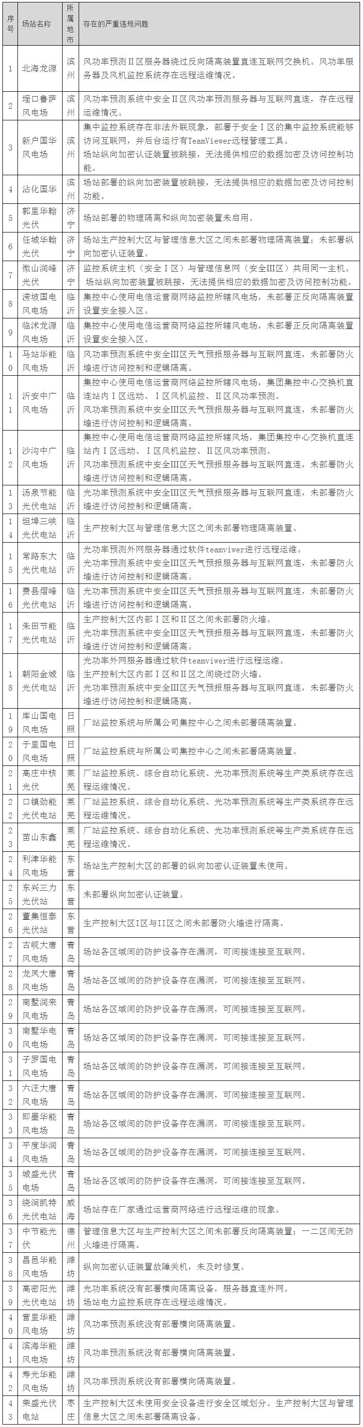 2016年以來,經(jīng)山東能源監(jiān)管辦多次現(xiàn)場檢查,山東電網(wǎng)內部分新能源場站(見附件一)存在重大隱患且并未整改到位。根據(jù)《關于對存在重大隱患的新能源場站解除并網(wǎng)的通知》(魯監(jiān)能安全[2017]37號)有關要求,山東電力調度控制中心決定于2017年3月28日14時起,將存在問題的新能源場站與電網(wǎng)解網(wǎng),并切斷場站與調度數(shù)據(jù)網(wǎng)的連接。