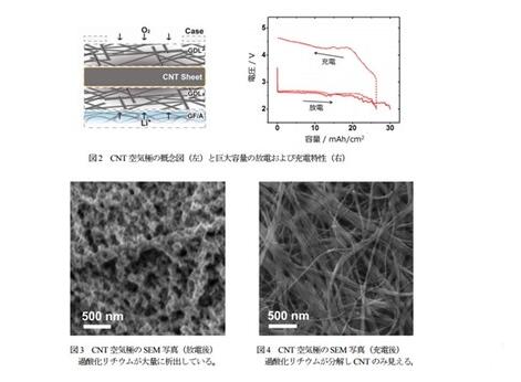 NIMS介紹稱,“鋰空氣電池”使用碳納米管作為空氣電極材料,通過電極結(jié)構(gòu)的優(yōu)化,可以實現(xiàn)30mAh/cm2的能量密度,這一數(shù)值是普通鋰電池的15倍之多(2mAh/cm2)。