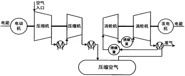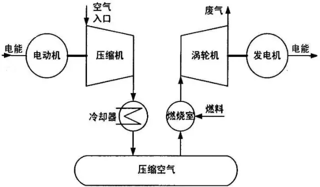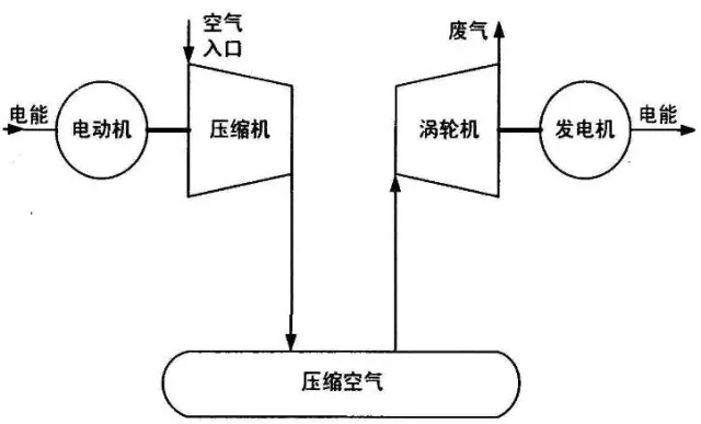 壓縮空氣的基本原理很簡單,在電網(wǎng)負(fù)荷低谷期將電能用于壓縮空氣,將空氣高壓密封在報(bào)廢礦井、儲氣罐、山洞、過期油氣井或新建儲氣井中,在電網(wǎng)負(fù)荷高峰期釋放壓縮空氣推動汽輪機(jī)發(fā)電的儲能方式,原理如下圖所示。若需要更近一步解釋,你只需鎖定儲氣罐內(nèi)的空氣即可,兩個(gè)動作,充氣時(shí)儲存能量,膨脹時(shí)釋放能量。