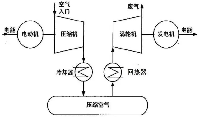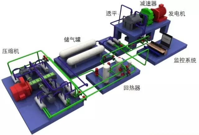 一套完整的壓空系統(tǒng)五大關(guān)鍵設(shè)備組成:由壓縮機(jī)、儲氣罐、回?zé)崞鳌⑴蛎洐C(jī)以及發(fā)電機(jī),結(jié)構(gòu)詳圖如下。