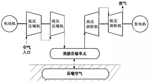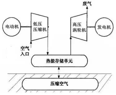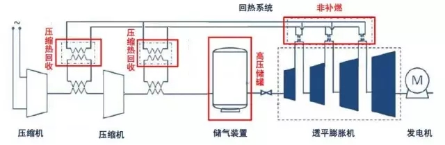 相較于原理型系統(tǒng),回?zé)嵯到y(tǒng)儲電效率有所增加,然而它的不足在于,冷卻器和回?zé)崞鞣珠_設(shè)置,在熱量回收過程中存在較大熱損失。為解決這一問題,有人提出絕熱壓縮空氣系統(tǒng),變異2,參照下圖。將壓縮過程中產(chǎn)生的熱量存儲起來,然后在發(fā)電過程中用這部分熱量預(yù)熱壓縮空氣,冷卻器和回?zé)崞骱蠟橐惑w,對外進(jìn)行絕熱處理,業(yè)內(nèi)稱作先進(jìn)絕熱壓縮空氣儲能系統(tǒng)(AA-CAES),該系統(tǒng)面臨的最大挑戰(zhàn)是如何經(jīng)濟(jì)、有效地設(shè)計(jì)和制造出壓力工作范圍大的壓縮機(jī)、渦輪機(jī)和除熱器。