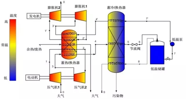 壓空系統(tǒng)的技術(shù)痛點(diǎn)在于氣體的密度太低,常壓下空氣密度為1.25kg/m3,即使在10Mpa高壓下密度也只有100kg/m3左右,相比水的1000kg/m3,差了足足十倍,這意味在相同儲存質(zhì)量下,空氣的罐子要比水大十倍。要解決大規(guī)??諝獯鎯Φ姆椒ㄖ辽儆?個(gè),方法一,就地取材,尋找廢棄的礦井,進(jìn)行密封承壓方面的改造,然后將空氣壓入其中,這種方法既經(jīng)濟(jì)又可靠,而且儲量驚人,比如德國的Huntorf壓空電站可儲存30萬立方的空氣,但是,這種方式受制于地形限制,靈活性差,比如我想在南京建一座壓空電站,即使金壇的溶洞再優(yōu)越,我也用不上。方法二,高壓儲氣罐,該方式操作靈活,完全不受地域地形限制,比如中科院在廊坊的示范項(xiàng)目,采用2個(gè)直徑2.4m,長10m的儲罐,每個(gè)儲存45m3的高壓空氣,儲罐壓力10Mpa,儲罐設(shè)備屬于特種設(shè)備范疇,無論從制造,安裝還是運(yùn)行,都要經(jīng)過嚴(yán)格的檢查,成本相對較高。方法三,空氣液化。為了進(jìn)一步減小儲罐體積,有專家想到了變態(tài),將氣體液化,密度將增加上百倍,于是體積減少上百倍,通過設(shè)計(jì),使膨脹機(jī)出口的空氣溫度低于78.6K(-196.5℃)時(shí),空氣被液化,系統(tǒng)流程見下圖,這種系統(tǒng)的特點(diǎn)是體積小,管路復(fù)雜,效率低。我在一次講座上跟東大熱能所的肖睿教授聊天時(shí)得知,他測算過液化壓空儲能的理論效率60%,實(shí)際效率能打七折就已經(jīng)很不錯(cuò)了。