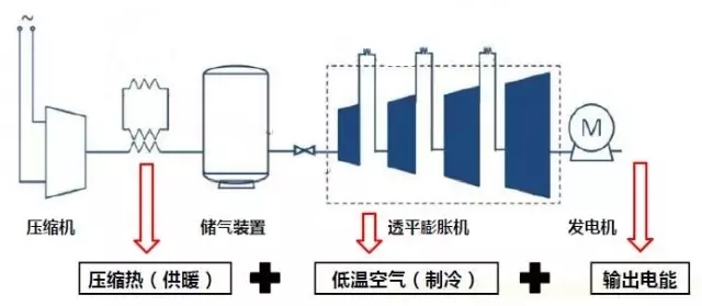 在儲能領(lǐng)域,壓空算是個(gè)另類,不能用傳統(tǒng)的評價(jià)標(biāo)準(zhǔn)衡量它,比如只追求電-電存儲效率,壓空肯定毫無優(yōu)勢,非補(bǔ)燃機(jī)組能達(dá)到40%已算很不錯(cuò)了。但它在發(fā)電的同時(shí),還能兼顧供冷和供熱,俗稱冷熱電三聯(lián)供,其實(shí)原理沒有任何改變,只是將壓縮過程產(chǎn)生的熱量用于供熱,膨脹機(jī)出口的低溫空氣用于制冷,膨脹產(chǎn)生的有用功用于發(fā)電,詳見下圖。冷熱電三聯(lián)供的特點(diǎn)是能源利用效率高,若以熱能利用為基礎(chǔ)測算,系統(tǒng)效率可達(dá)70-85%。