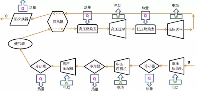 采用燃?xì)庋a(bǔ)熱的系統(tǒng),多級壓縮階段與非補(bǔ)燃一致,不同的是在各級膨脹機(jī)入口加裝燃燒室,詳見下圖。