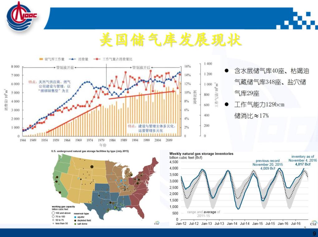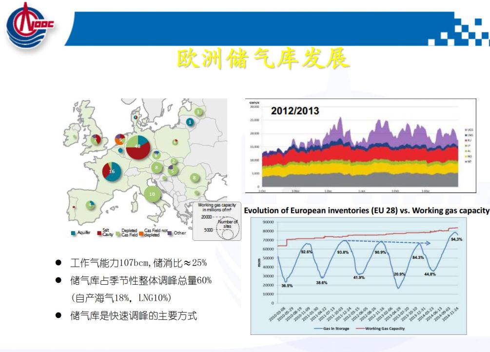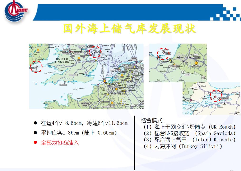 這是歐洲儲氣庫的運(yùn)行特性,冬天滿足采暖,整個歐洲靠天然氣,雖然歐洲的可再生能源發(fā)展很好,但是它的調(diào)峰目前還是以天然氣為主。這是它的運(yùn)行機(jī)制,包括歐洲和美國的天然氣價格是放開的,求大于供就漲價了,供大于求就降價了。便宜的時候美國四五毛錢一方氣,用不了就存起來,到了冬天天氣很冷的時候,賣到三四塊錢完全有可能,這套體系儲氣庫和管道,包括電網(wǎng)都可以實現(xiàn)盈利,但是價格要放開。這是其他國家的一些海上儲氣庫,因為我們海油主要是從海上的老氣田轉(zhuǎn)儲氣庫。現(xiàn)在的管道都聯(lián)同了,可以互相互聯(lián)相互串氣。到了冬天如果華北、東北、西北需要采暖的時候,我們和他簽增量合同,完全可以解決。