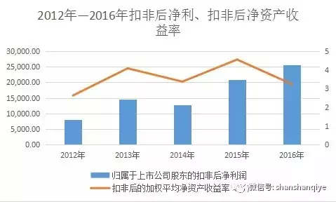 上面我們主要橫向解讀了杉杉股份2016年的主要財(cái)務(wù)數(shù)據(jù)和各板塊業(yè)務(wù)情況,下面我們從縱向來(lái)對(duì)比分析杉杉股份最近五年的主要財(cái)務(wù)指標(biāo)。我們選取杉杉股份2012年至2016年的營(yíng)收、毛利、歸屬于上市公司股東的扣非后凈利、扣非后加權(quán)平均凈資產(chǎn)收益率這四個(gè)最重要的財(cái)務(wù)數(shù)據(jù)來(lái)進(jìn)行對(duì)比分析。