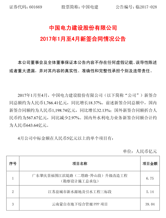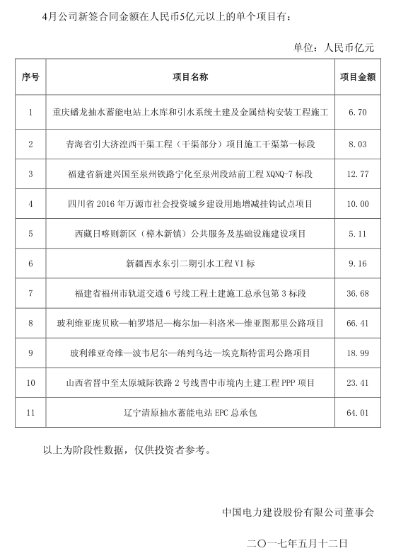中國(guó)儲(chǔ)能網(wǎng)訊:中國(guó)電建發(fā)布了2017年1-4月新簽合同情況公告,4月公司新簽合同金額在人民幣5億元以上的單個(gè)項(xiàng)目中包含重慶蟠龍抽水蓄能電站上水庫(kù)和引水系統(tǒng)土建及金屬結(jié)構(gòu)安裝工程施工和遼寧清原抽水蓄能電站EPC總承包兩個(gè)水電項(xiàng)目,詳情如下: