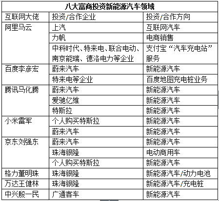 正是看到了這個巨大“蛋糕”,阿里馬云、百度李彥宏、騰訊馬化騰、小米雷軍、京東劉強東、格力董明珠、萬達王健林、中興殷一民等八大富商紛紛投資了新能源汽車相關(guān)領(lǐng)域。