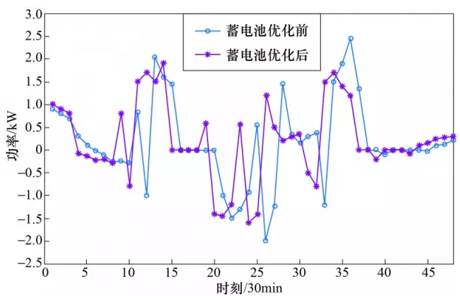對比風光出力以及核心負荷運行的時間段,從計算結(jié)果可以看出:溫控負荷的運行集中在風光出力較為充足的時段或者電價處于谷時段和平時段,但是由于用戶對負荷有舒適度的要求,如熱水器和空調(diào),在晚上18:00至22:00之間用電高峰時段也需要有適當集中的運行時間??赊D(zhuǎn)移負荷中的洗衣機設備在優(yōu)化后,運行時間被轉(zhuǎn)移到電價最為低廉的清晨,且這時候風力發(fā)電相對充足,符合能量管理策略最初的設計期望,對于電飯鍋的運行時段,也是符合日常生活規(guī)律的,且在一定程度上提前或延遲其運行時段,達到了優(yōu)化的要求。由圖6可以看出,在負荷需求量較大的時段18:00至22:00、14:00至16:00處于負荷用電高峰時段,且此時的電價也處于峰值階段,蓄電池放電較多,而在負荷需求量較小的上午且電價處于谷值時,蓄電池得以充電。并且可以看出優(yōu)化后的蓄電池充放電深度明顯小于優(yōu)化前的充放電深度,因此可以適當降低蓄電池的配置容量,從而符合虛擬儲能的優(yōu)化目標。