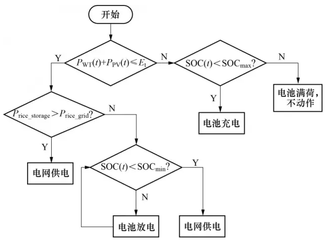 (1)光伏陣列和風機依舊工作在最大功率跟蹤模式;為了最大化利用風光出力,蓄電池按照如下策略進行工作。