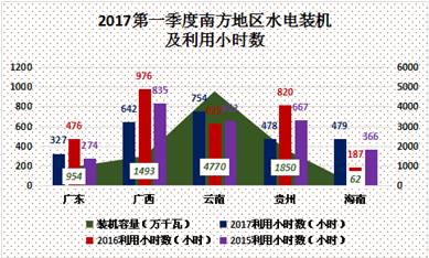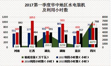 2017年第一季度,全國水電設(shè)備平均利用小時數(shù)623小時,同比降低68小時。水電裝機容量超過1000萬千瓦的7個省份中,除云南外,其余省份水電設(shè)備平均利用小時數(shù)同比均有不同程度降低。