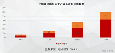根據(jù)起點(diǎn)研究(SPIR)統(tǒng)計(jì),2016年中國(guó)鋰電池電芯設(shè)備規(guī)模為75億元,同比增長(zhǎng)超過(guò)100% 。其中國(guó)產(chǎn)設(shè)備占55億元。