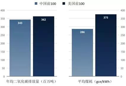 圖2 中美燃煤機(jī)組二氧化碳排放和發(fā)電煤耗對比