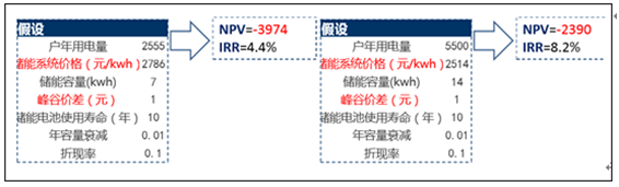 Powerwall已經(jīng)發(fā)布2代產(chǎn)品,一代Powerwall7度電/3000美金,二代產(chǎn)品14度電/5500美金,從戶用經(jīng)濟 性角度來看,我們按照光伏板發(fā)電成本0,戶用電成本1元計算峰谷價差,以一個7度電/天乘以365天, 和一個14度電/天乘以365天的標準住戶為模型測算,內(nèi)部IRR分別為4.4%和8.2%,凈現(xiàn)值都為負值。