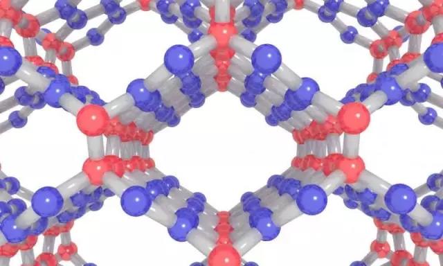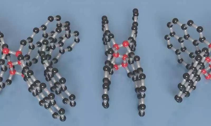 通過混合sp2 / sp3的通道觀察壓縮玻璃碳中的互穿石墨烯網(wǎng)絡(luò)。 石墨烯片(藍(lán)色球體)在菱形節(jié)點(diǎn)(紅色球體)處交聯(lián)。