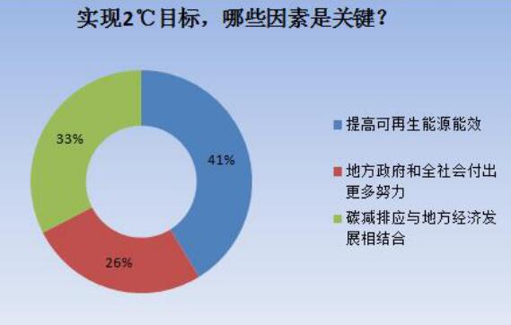 還有33%的受訪人群認(rèn)為,碳減排應(yīng)與地方經(jīng)濟(jì)發(fā)展相結(jié)合是實(shí)現(xiàn)2℃目標(biāo)的關(guān)鍵因素。