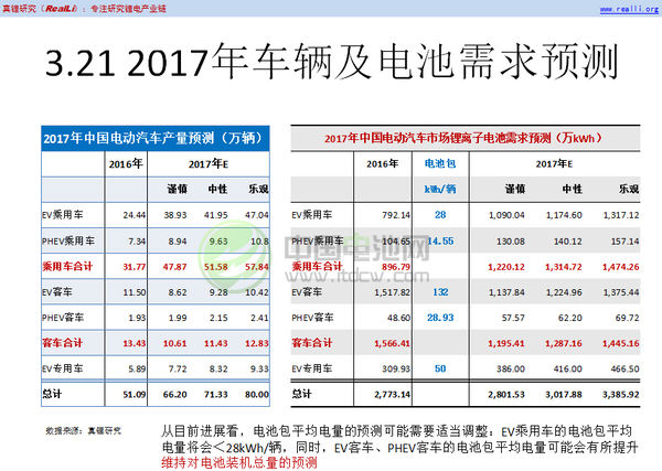 據(jù)以上數(shù)據(jù)推算,2017年中國電動(dòng)汽車市場 鋰離子電池 需求謹(jǐn)慎預(yù)測為2,801.53萬kWh、中性預(yù)測為3,017.88萬kWh、樂觀預(yù)測為3,385.92 萬kWh。墨柯認(rèn)為,2017年EV乘用車的電池包平均電量將會(huì)小于28kWh/輛,同時(shí),EV客車、PHEV客車的電池包平均電量可能會(huì)有所提升。
