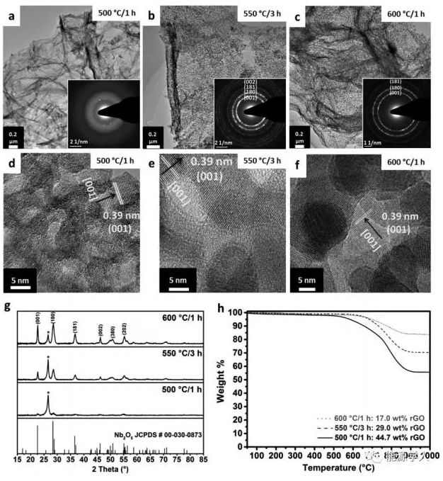 圖1.在特定條件下空氣中煅燒的Nb2O5納米片的(a-c)TEM圖和SAED圖(插圖),(d-f)HRTEM圖,(g)XRD圖(*表示rGO峰),和(h)空氣中的熱重分析(TGA)圖。