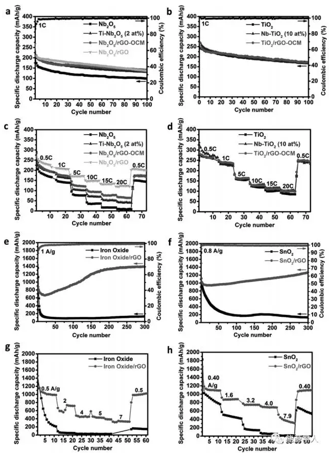 圖2.(a,b,e,f)循環(huán)穩(wěn)定性和(c,d,g,h)倍率性能,(a,c) Nb2O5(1C=150mA/g),(b,d)TiO2(1C=168mA/g),(e,g)氧化鐵和(f,h)SnO2納米片。