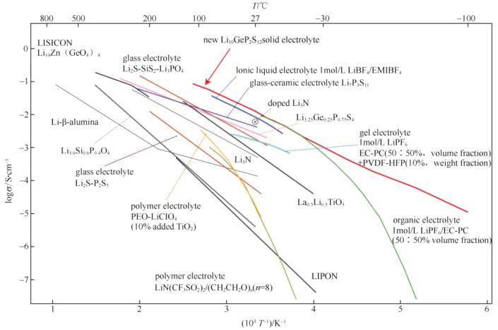 典型的各類鋰電解質(zhì)材料電導(dǎo)率隨溫度的變化