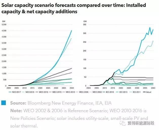 2017年彭博新能源財(cái)經(jīng)新能源市場長期展望預(yù)測,光伏和光熱的總裝機(jī)將達(dá)4,506GW,而IEA報(bào)告則僅在“新政策情景”下,給出了1481GW的預(yù)測值。