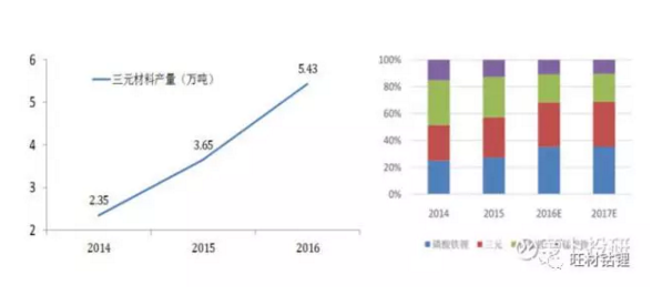 三元電池的正極材料是鎳鈷錳酸鉀三元材料,統(tǒng)計數(shù)據(jù)顯示,2016年中國鋰電三元材料產(chǎn)量5.43萬噸,同比增長48.8%;產(chǎn)值79.8億元,同比增長超過60%,其技術(shù)構(gòu)成占比在四種正極材料(磷酸鐵鋰、三元材料、鈷酸鋰、錳酸鋰)中最高。