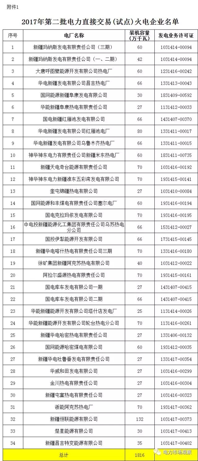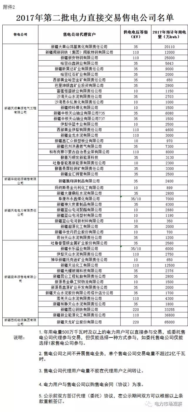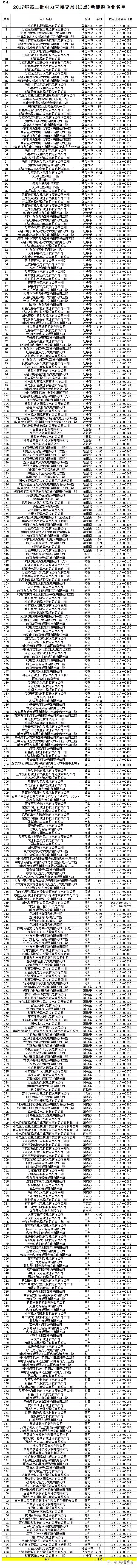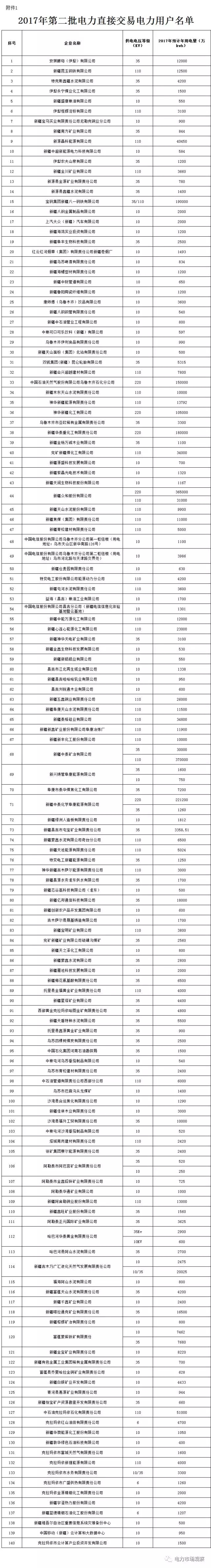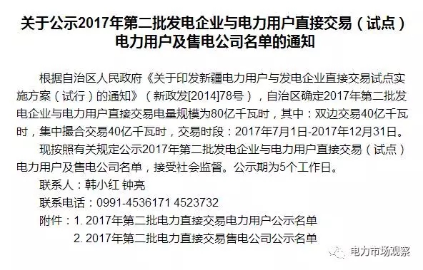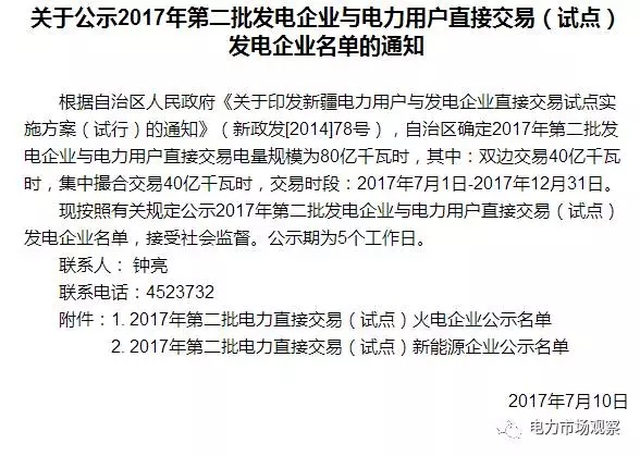 7月12日,新疆經(jīng)信委又發(fā)布了《關(guān)于公示2017年第二批發(fā)電企業(yè)與電力用戶直接交易(試點(diǎn))發(fā)電企業(yè)名單的通知》。